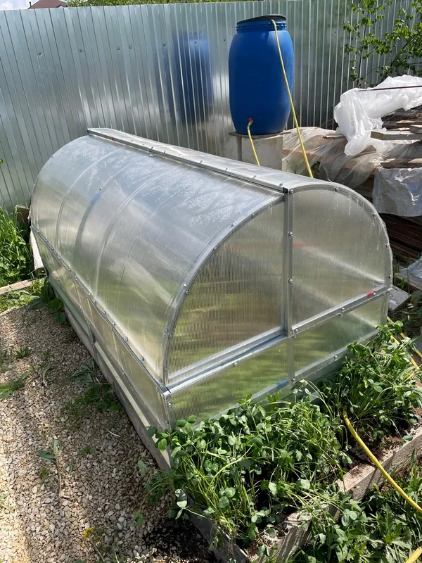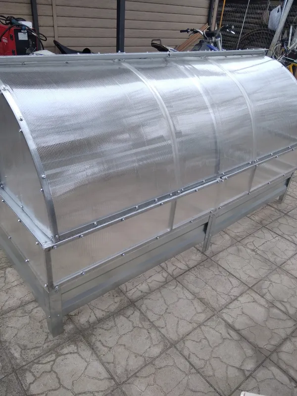 Каркас парника выполнен из оцинкованной трубы с размером 20*20 мм, что обеспечивает прочность и долговечность конструкции. Поликарбонатные стенки сделаны из 14 выкроенных деталей, что обеспечивает хорошую защиту от внешних условий.